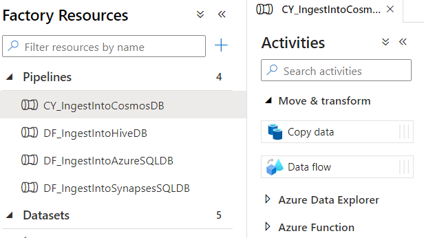 Similar to the old traditional way of creating SSIS packages with control and data flows, one gets factory resources to build data workflows. Generally, one would spend more time here, authoring pipelines and data flows. We create pipelines to execute one or more activities.