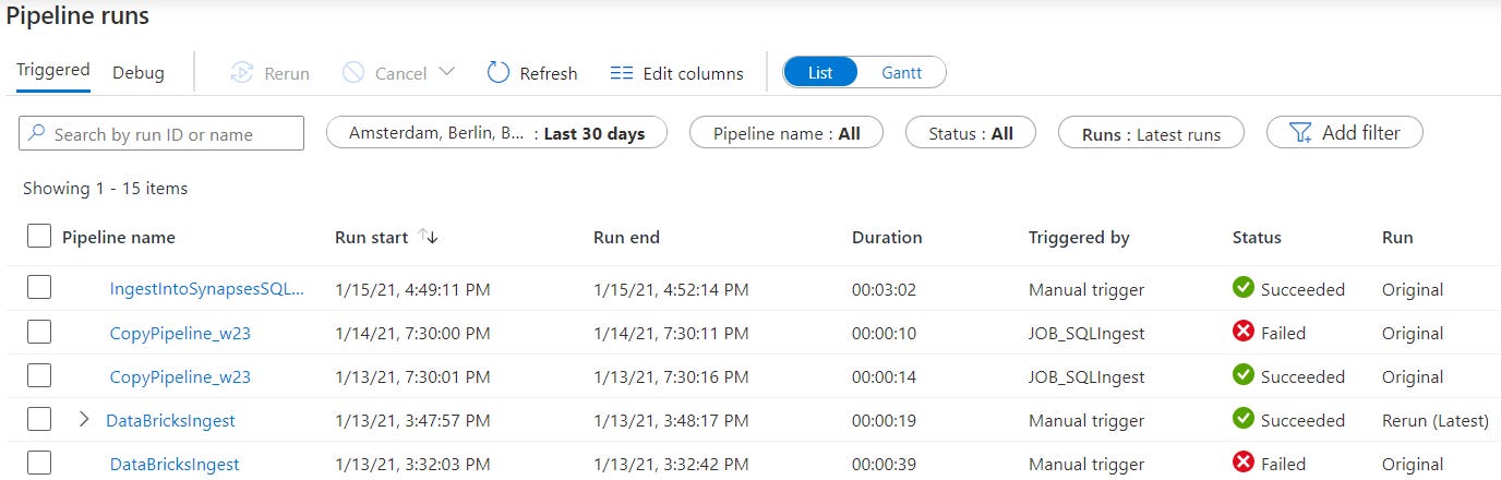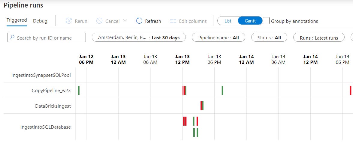 One could change the display as Gantt chart, to get a good sense of pipeline runs w.r.t time-line and duration, as shown below. Also, when working in multiple time zones, one could easily switch the runs into local time zone.