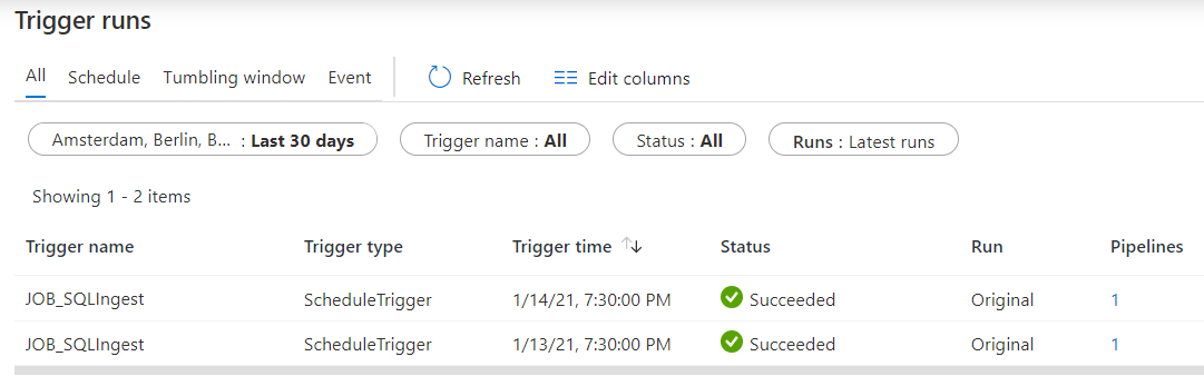 The "Trigger runs" are more like the SQL Server job history, as shown below.